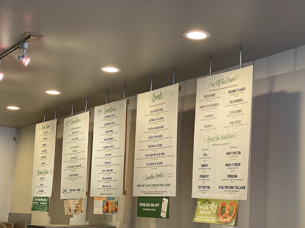 Mango, Ginger, Lemonade, Orange Sherbet, Apple/Mango Juice Blend, Tajin® Cal: 170/300/500 (Vegetarian, Gluten-Free) 2,000 calories a day is used for general nutrition advice, but calorie needs may vary. Juice blends are made from concentrate using natural flavors and juice % may vary. Ingredients listed by flavor profile. For full nutritional information, and ingredients listed by weight, use your web browser to visit juiceitup.com.